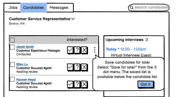 The enthusiastic reception of the "save candidates for later" feature in particular indicated strong potential for increasing employer retention and satisfaction with the platform.
